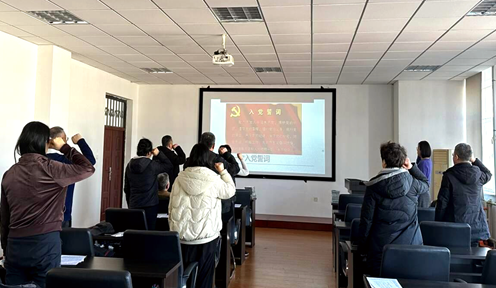 随后,在党支部书记的带领下,全体党员庄严地重温了入党誓词。誓词坚定有力,体现了党员们对党忠诚的政治品格和对党坚定不移的信仰,这是党员们对自身党员身份的深刻认同。通过重温誓词,党员们的初心得到再次净化,党性观念得到进一步地巩固,共产主义信仰更加坚不可摧。